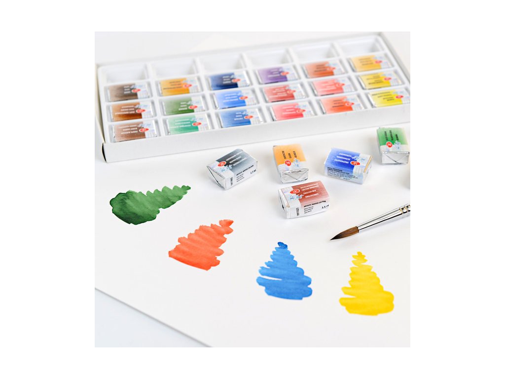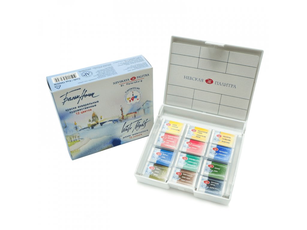 Akvarelové barvy White Nights jsou polosuché barvy v plastových vaničkách o obsahu 2,5 ml. Tato sada 24 barev je pečlivě uložena do praktické plastové kazety. Je možné sadu rozšířit a přikoupit další "kostičky" barev. Plastová kazeta také zaručuje bezpečné uložení barev při přenášení.