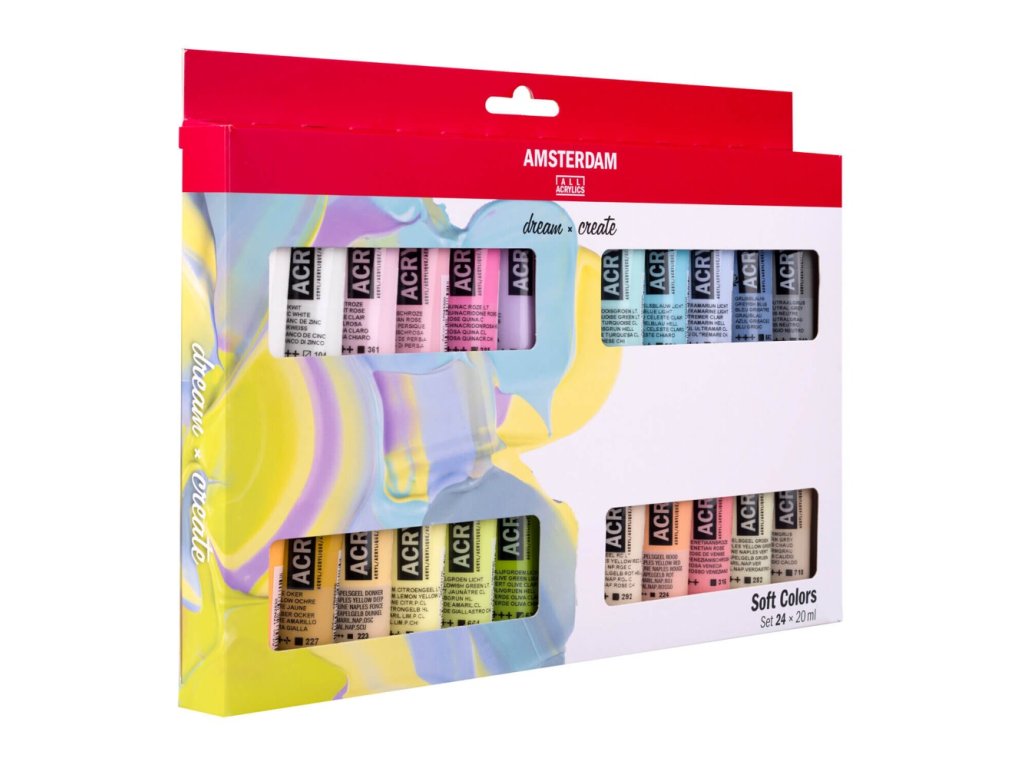Sada barev Amsterdam Soft Colors od nizozemské značky Royal Talens obsahuje 24 akrylových barev po 20 ml v jemných pastelových odstínech. Barvy ze série Standard Series se vyznačují střední viskozitou – ideální pro tahy štětcem, hladké překrytí i jemnou texturu. Mají saténový lesk, vynikající světlostálost a po zaschnutí vytvářejí odolný, flexibilní a permanentní barevný film.
