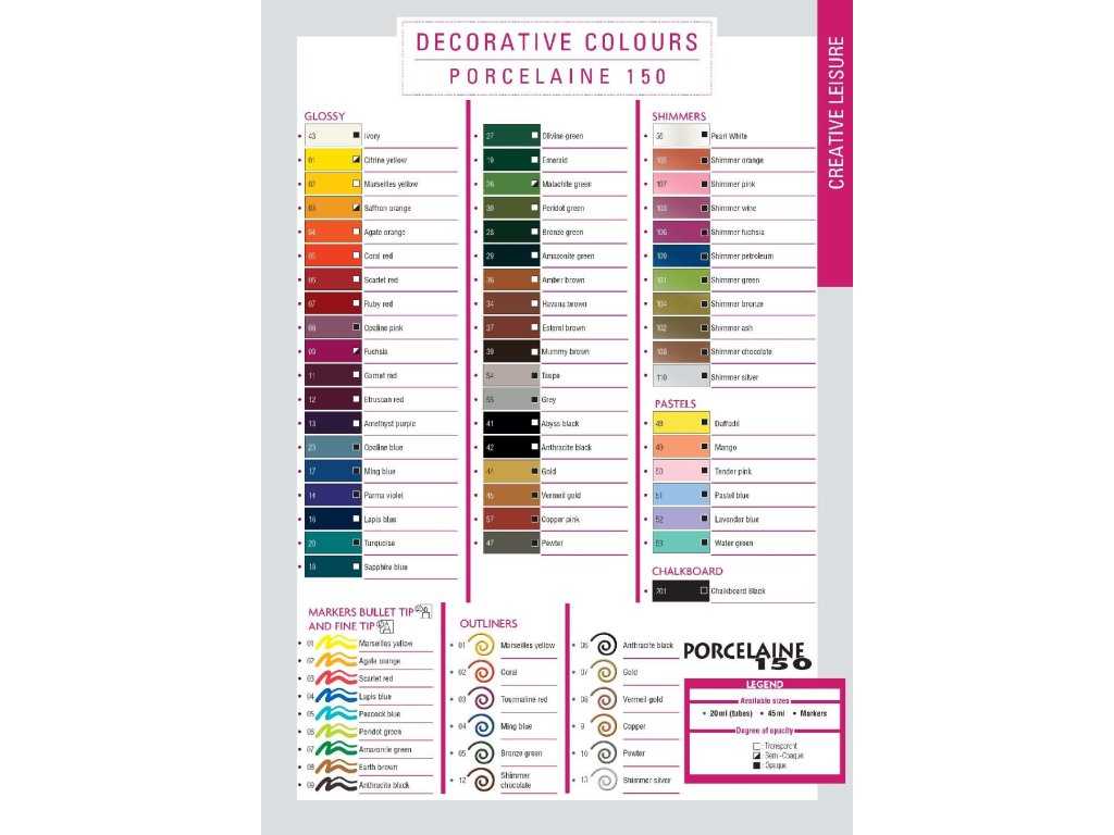 Vypalovací barvy na porcelán a sklo a další hladké povrchy. Barvu lze použít i na porézní keramiku. Nejprve však předmět přetřeme plničem pórů Porcelaine 150 filler undercoat, poté malujeme keramiku barvou Porcelaine 150. Při malování na porcelán, který bude používán v kuchyni, doporučujeme malované nádobí zafixovat. Fixování probíhá v pečící troubě na 150 stupňů. Pečeme 35 minut po dosažení teploty. Kvůli teplotnímu šoku je vhodné umístit předměty do studené trouby a vydělat je také až po vychládnutí. Po zafixování lze nádobí mýt v myčce. Písmo a obrysy obrázků vytvoříme jednoduše pomocí kontury Porcelaine 150. Barvy Pébéo Porcelaine 150 nanášíme nejlépe stětcem s přírodním vlasem.Doplňkové parametry