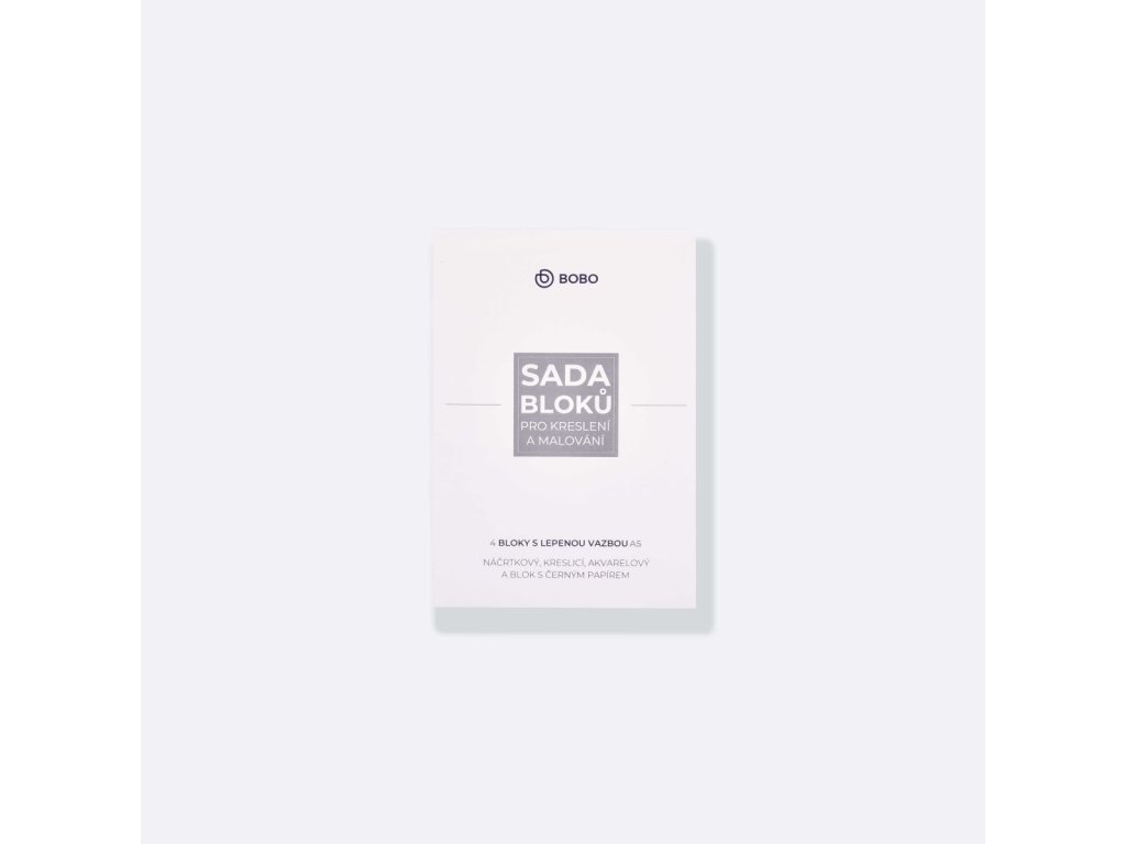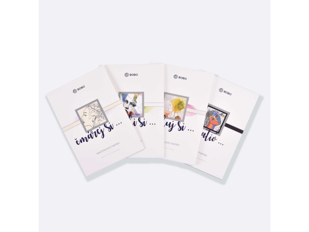 BOBO sada skicáků A4 s lepenou vazbou je výtvarná sada složená ze čtyř samostatných bloků, z nichž každý obsahuje jiný typ papíru. Díky tomu se hodí jako praktický průvodce tvorbou: od prvotních nápadů a náčrtů, přes kresbu a práci s barvou, až po malbu na akvarelový karton a negativní kresbu na černý karton.