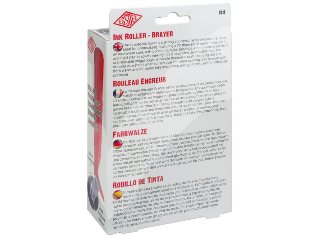 Essdee standardní inkoustový váleček je navržen pro precizní tisk linorytem a další techniky tisku. Váleček je vyroben z tvrdé, odolné gumy EPDM s tuhostí 70 Shore, osazený hliníkovým jádrem, samomazacími nylonovými ložisky a celoocelovým horním rámem – vše pro maximální životnost a spolehlivost při častém používání.