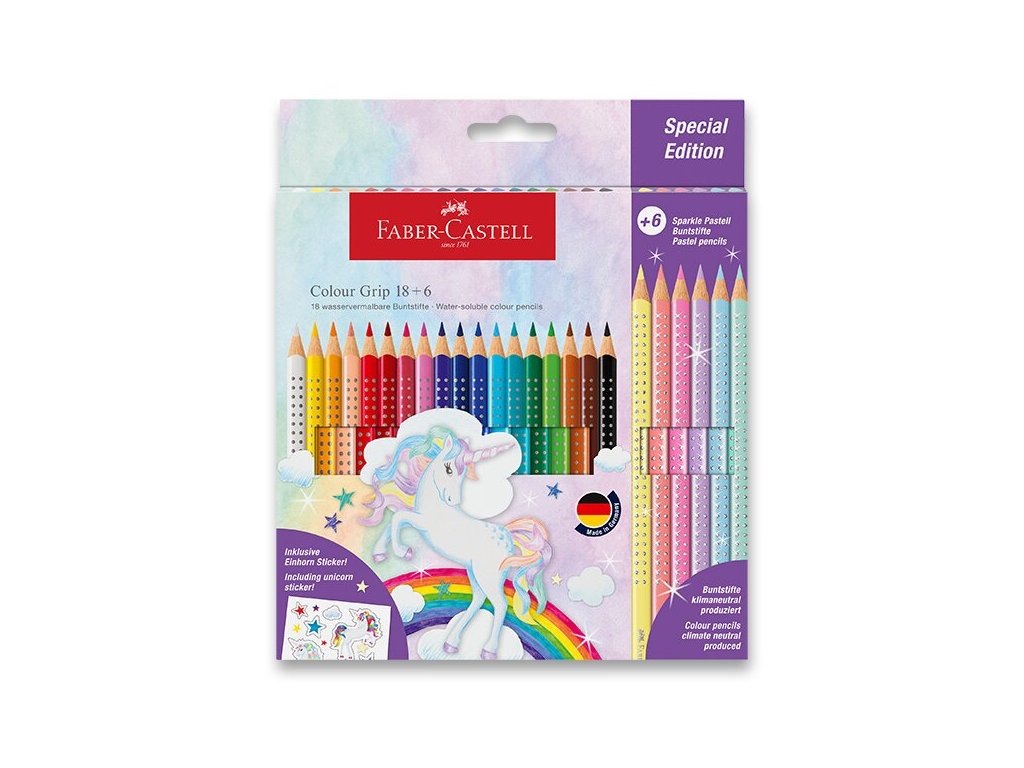 Faber-Castell Colour Grip 18+6 ks, akvarelové pastelky, motiv Jednorožec