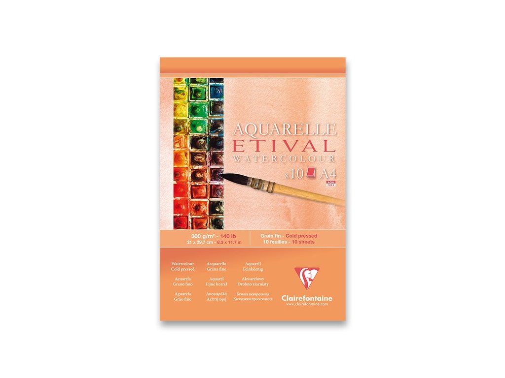 Akvarelový blok Clairefontaine Etival je vyroben ze 100% celulózy, má střední zrnitost a vysokou gramáž 300 g/m². Listy jsou lepené na kratší straně, což usnadňuje práci s vodou i následné oddělení hotových prací. Povrch výborně přijímá barvu a umožňuje vícenásobné nanášení vrstev.