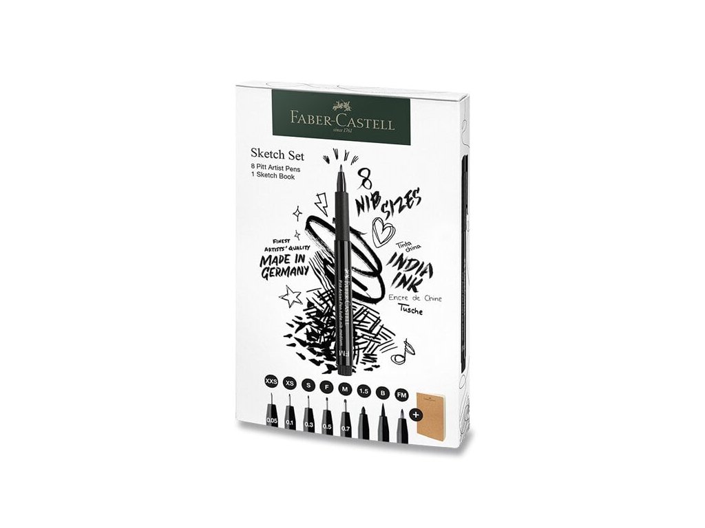Sada kombinuje umělecké popisovače Faber-Castell Pitt Artist Pen a kompaktní skicář v přírodní bílé. Popisovače využívají pigmentovaný inkoust s vysokou světlostálostí, který je bez kyselin, pH neutrální a po zaschnutí voděodolný. Různé typy hrotů pokrývají ultra jemnou linku i pružný štětcový tah, vhodné pro kontury, detailní kresbu, linkování, hand lettering i stínování křížením čar.