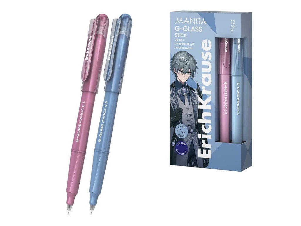ErichKrause G-Glass Stick Manga je gelové pero s jehlovým jemným hrotem pro přesné a rychlé psaní. Kulička 0,5 mm vytváří stopu o šířce 0,4 mm a modrý gelový inkoust rychle zasychá; dle specifikace je odolný vůči světlu i vodě. Deklarovaná délka souvislé linky je až 1000 m.