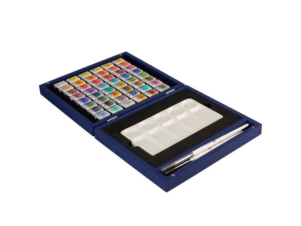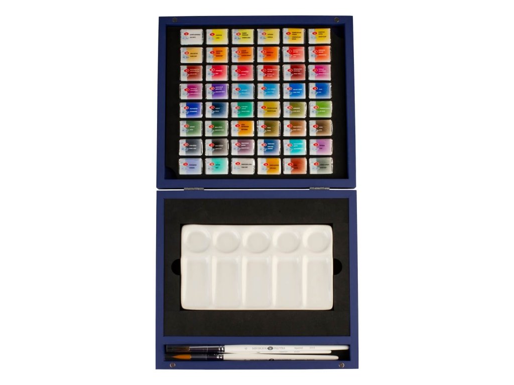 Luxusní sada akvarelových barev White Nights 48 ks v modré dřevěné kazetě s příslušenstvím