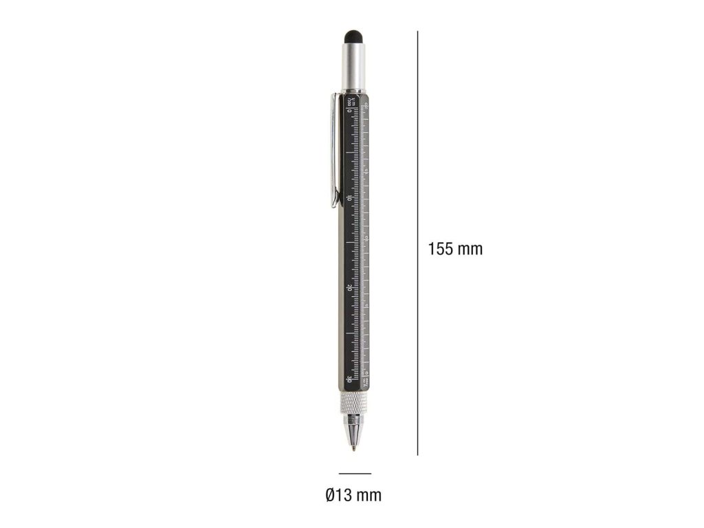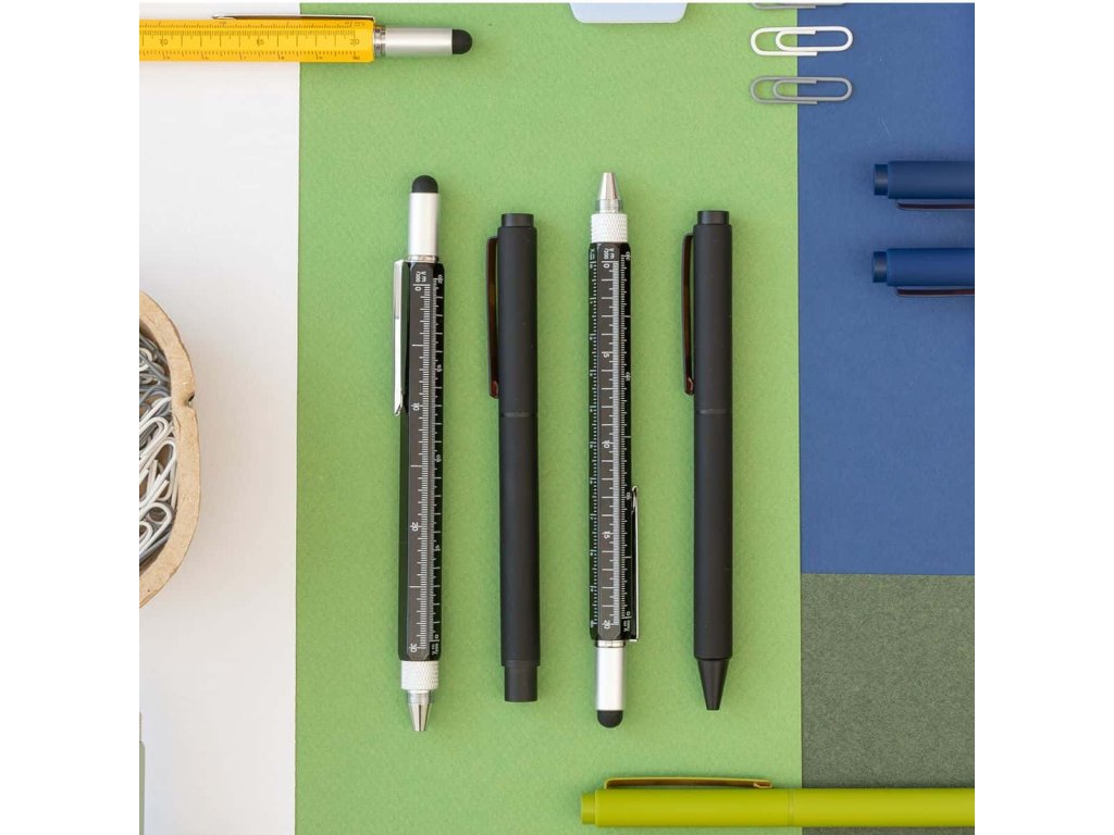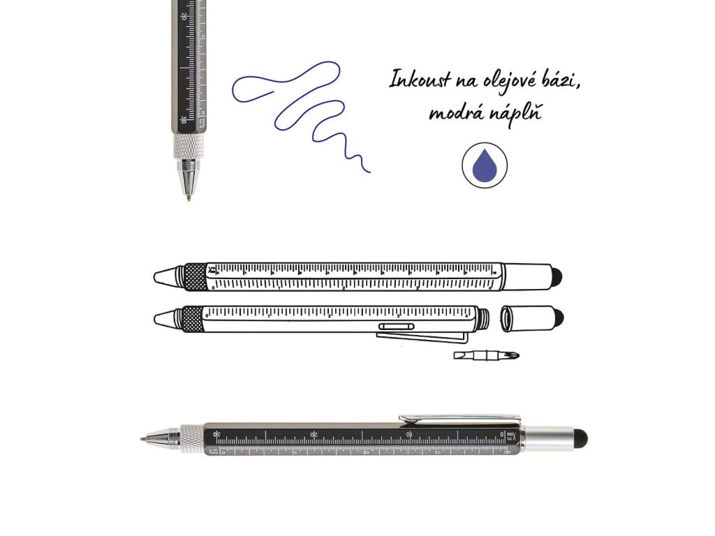 - 5 v 1: kuličkové pero, pravítko v cm i palcích, vodováha, plochý a křížový šroubovák, dotykový stylus
