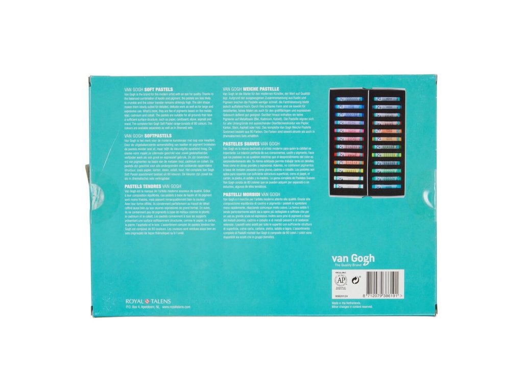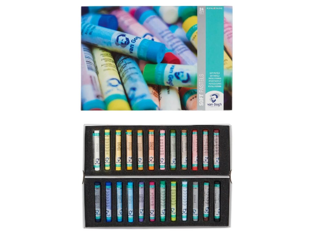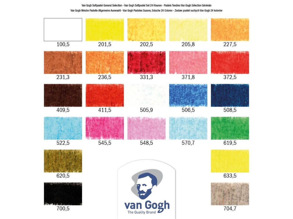 Tato sada 24 měkkých pastelů Van Gogh (general selection set) (kód 90820124) obsahuje bohatou paletu barev pro všestranné použití od detailní kresby až po ploché vrstvy. Kulaté slim tyčky jsou složeny z vysoce kvalitních pigmentů a kaolínové hlíny, díky čemuž mají příjemnou sametovou texturu a nižší náchylnost k drobení.