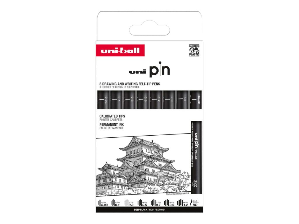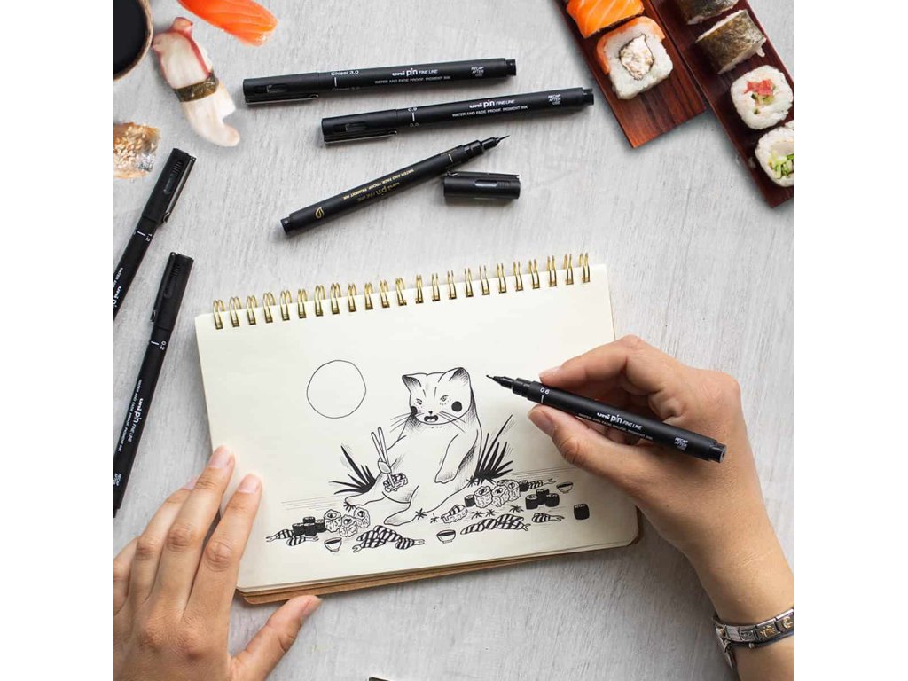 Odolné, kovově vyztužené hroty jsou vhodné pro práci s pravítky a šablonami a v kombinaci s pigmentovým Uni Super Ink zajišťují stálou, voděodolnou a světlostálou kresbu bez rozpíjení; inkoust je kompatibilní s akvarelem, takže kontury zůstávají ostré i při lavírování.