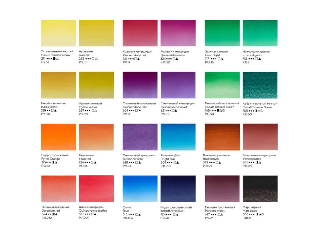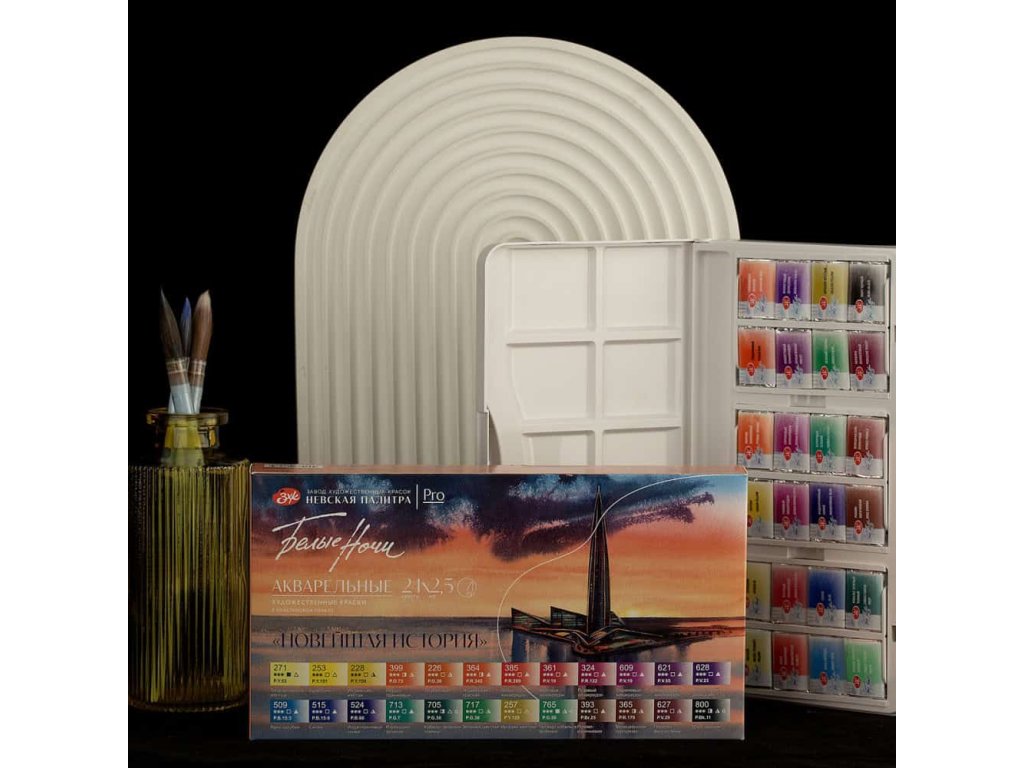 Akvarelová sada White Nights „Moderní historie“ (Modern History) nabízí 24 světlotrvalých monopigmentových odstínů postavených na moderních pigmentech 20. století. Sestava je navržena jako nový pohled na základní paletu: poskytne čisté směsi bez zakalení, přesné míchání i jemné optické přechody.