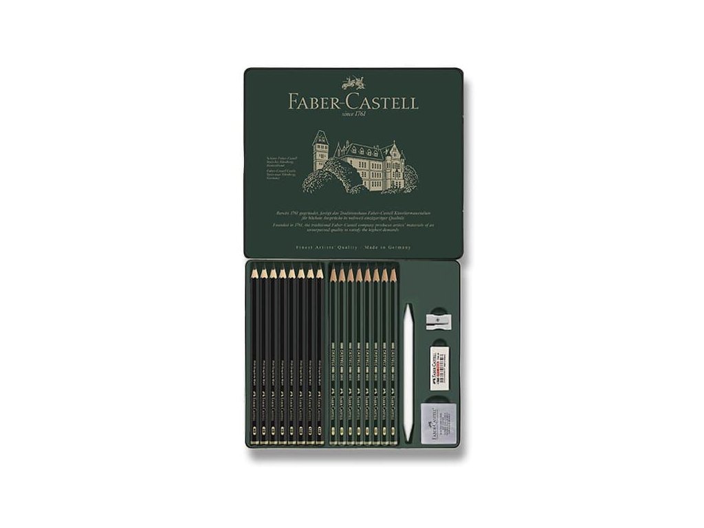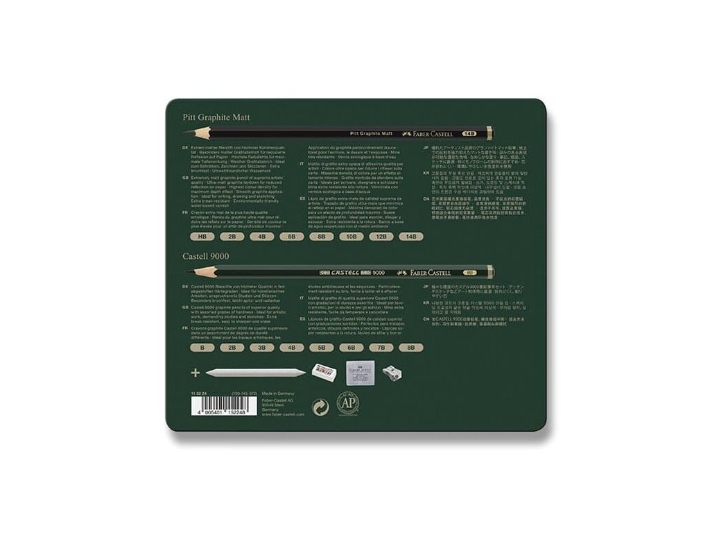 | Obsah sady tužek: | 8× Pitt Graphite Matt (HB, 2B, 4B, 6B, 8B, 10B, 12B, 14B), 8× Castell 9000 (B, 2B, 3B, 4B, 5B, 6B, 7B, 8B) |