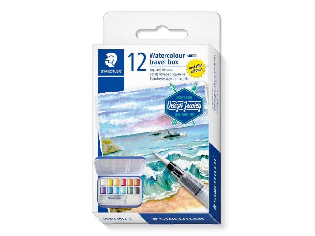 Sada akvarelových barev STAEDTLER Design Journey 888 je určená pro malbu metalickým akvarelem s možností vytvářet jemné, transparentní přechody a zároveň barvy vrstvit pro intenzivnější výsledek. Praktická krabička má víko, které slouží jako paleta pro míchání odstínů, takže je možné barvy pohodlně míchat i mimo ateliér.