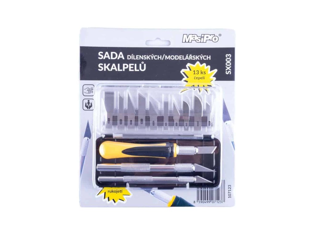 Sada skalpelů MasiPro SX003 je univerzální řešení pro detailní řezání v dílně i domácím hobby. Tři rukojeti a 13 typů čepelí pokrývají jemné, přesné i silovější řezy v materiálech, jako je textil, papír, karton, pěnové desky a tenká balza. Přesné břity umožňují čisté rovné řezy, křivky i vyřezávání detailů bez třepení okrajů.