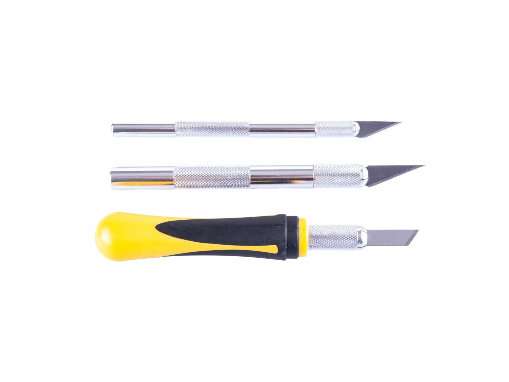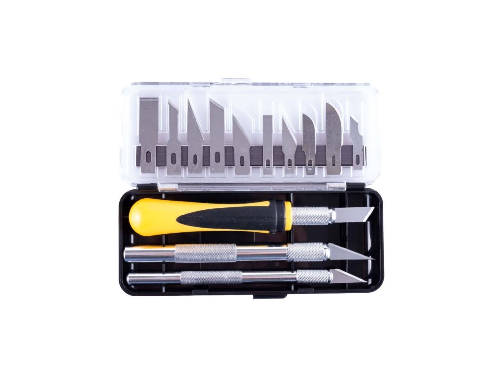 Šroubovací upínání zajišťuje pevné uchycení a rychlou výměnu čepelí, vroubkovaný povrch rukojetí podporuje jistý úchop a kontrolu nad vedením řezu. Sada je vhodná pro modeláře, designéry, kutilské projekty, scrapbooking i jemné opravy.