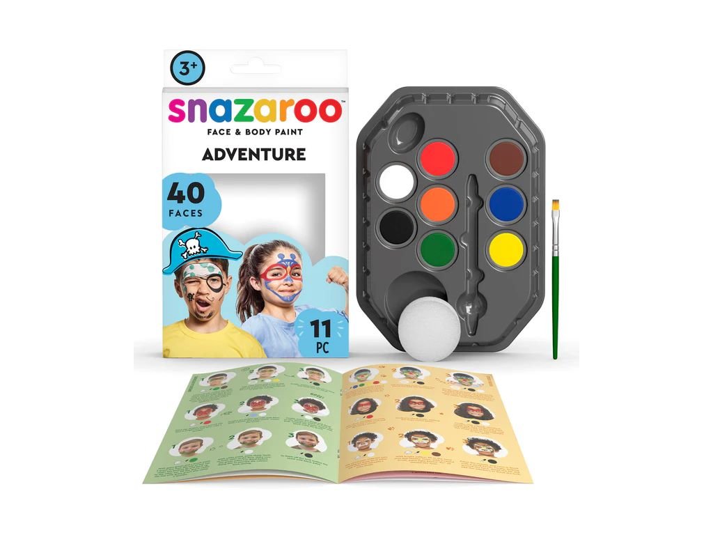 Profesionální sada Snazaroo Dobrodružství je kompaktní řešení pro bezpečné a rychlé malování na obličej i tělo. Obsahuje 8 základních odstínů po 2 ml / 2,1 g (černá, bílá, jasně červená, světle žlutá, tmavě zelená, modrá, světle hnědá, oranžová), kvalitní štětec, houbičku a podrobný fotografický návod krok za krokem. Barvy na vodní bázi se snadno aktivují kapkou vody, dobře kryjí, drží na pokožce a po skončení se jednoduše smyjí vodou a mýdlem.