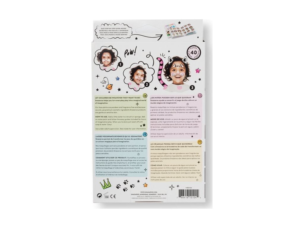 Snazaroo sada obličejových a tělových barev nabízí praktické řešení pro rychlou a bezpečnou proměnu na jakoukoli příležitost. V balení najdete 8 barev po 2 ml (bílá, černá, světle žlutá, světle zelená, růžová, metalická stříbrná a dvě třpytivé), dále houbičku, štětec a podrobný obrázkový návod krok za krokem. Barvy jsou na vodní bázi, aktivují se kapkou vody a po zaschnutí drží na kůži, přitom je lze snadno smýt vodou a mýdlem.