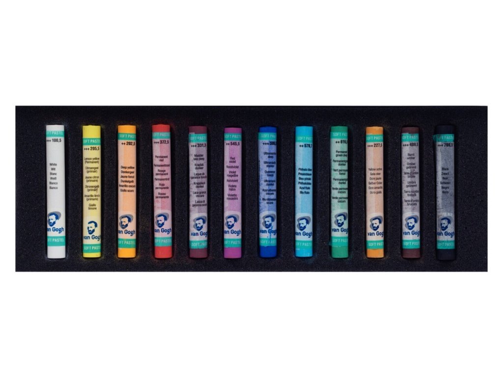 Tento Van Gogh Soft Pastel starter set obsahuje 12 pečlivě zvolených odstínů, které tvoří ideální základ pro pastelové kresby a malby. Kulaté tyčky s vysoce kvalitními pigmenty a kaolínovou hlínou zajišťují hladké nanášení, sametový efekt a menší náchylnost k drobení.