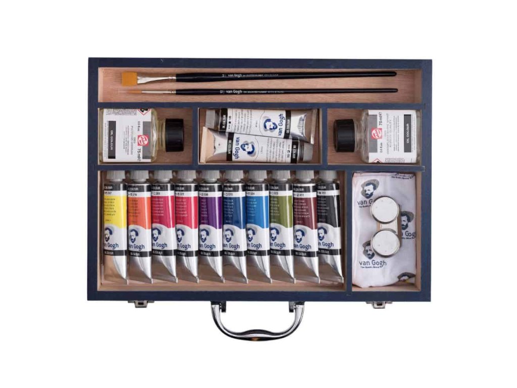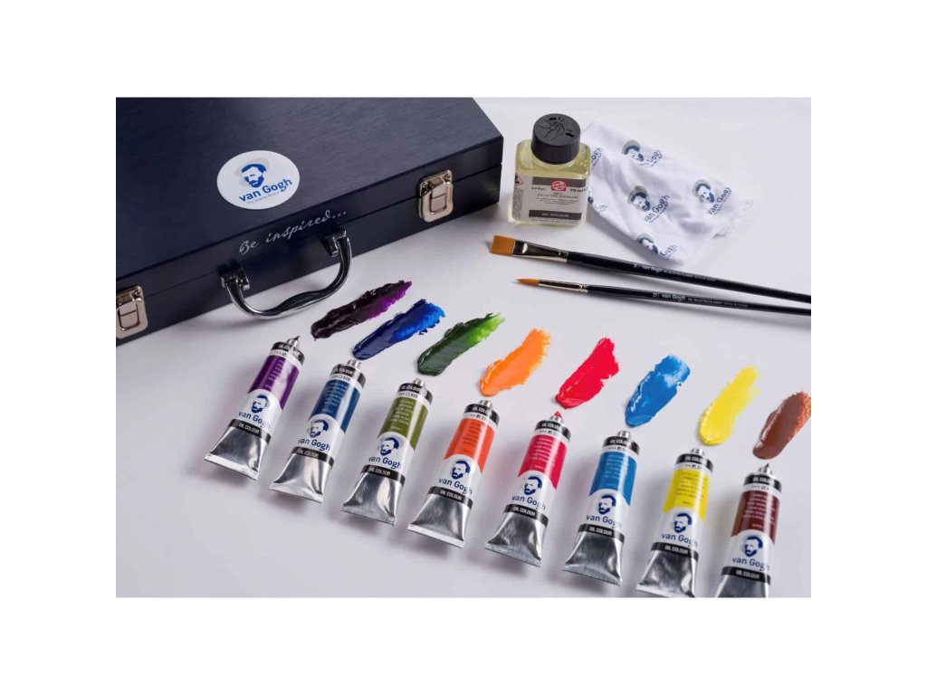 Olejová sada Van Gogh Starter XL v dřevěném kufříku je kompletní startovací set pro ty, kteří chtějí začít s olejomalbou nebo rozšířit svou stávající výbavu. Obsahuje 12 tub olejových barev Van Gogh o objemu 40 ml ve vybraných základních i doplňkových odstínech. Kvalitní, dobře kryvé a barevně stálé barvy vytvářejí vyváženou paletu, se kterou snadno namícháte široké spektrum tónů pro krajiny, portréty i abstraktní malbu.