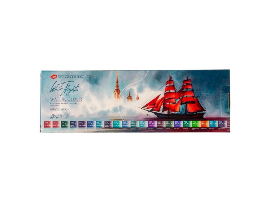 White Nights profesionální akvarelové barvy – sada 21 granulujících odstínů v kovovém boxu (2,5 ml)